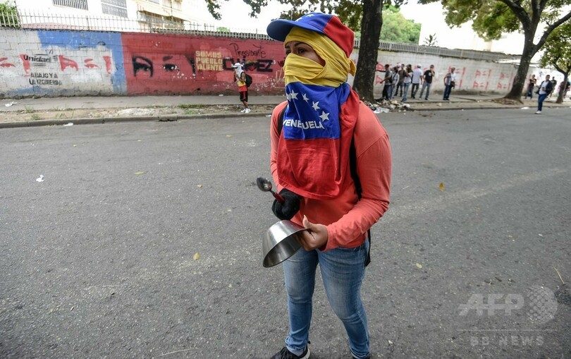 【6月4日 AFP】南米ベネズエラの首都カラカス(Caracas)で3日、ニコラス・マドゥロ(Nicolas Maduro)大統領の反対派が、同大統領の退陣を求める運動をより多くの貧困層に広げようと、飢えの象徴として手にした空の鍋をたたきながら行進するデモを行った。