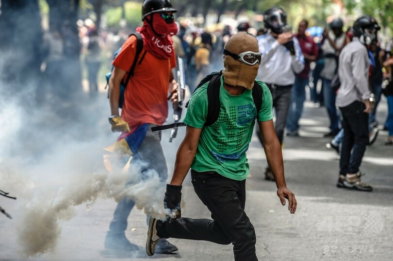 約2か月間に及んでいる反政府デモでは、デモの参加者たちと警官隊との衝突などでこれまでに64人の死者が出ている。マドゥロ政権は大きく揺れており、国際社会は懸念を示している。(c)AFP/Alex VASQUEZ