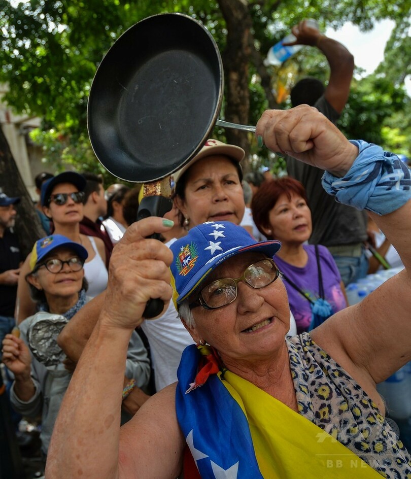 ベネズエラ首都で反政府デモ、空の鍋で「飢え」を訴える