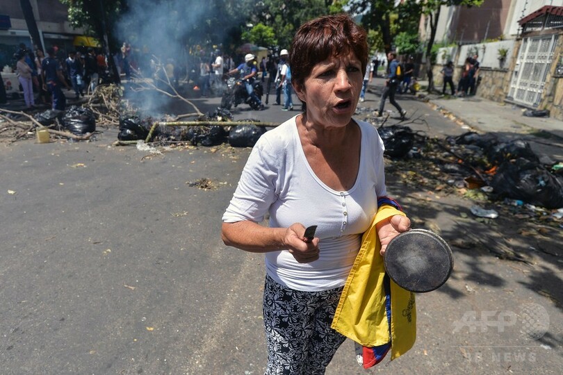 【6月4日 AFP】南米ベネズエラの首都カラカス(Caracas)で3日、ニコラス・マドゥロ(Nicolas Maduro)大統領の反対派が、同大統領の退陣を求める運動をより多くの貧困層に広げようと、飢えの象徴として手にした空の鍋をたたきながら行進するデモを行った。