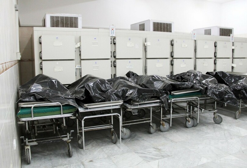 リビアの首都トリポリの病院で、担架に乗せられた移民らの遺体(2017年6月5日撮影)。(c)AFP/MAHMUD TURKIA