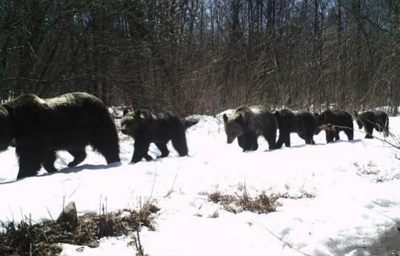 6月5日は「世界環境デー(World Environment Day)」だった。国家林業局猫科動物研究センター常務副主任兼東北林業大学(Northeast Forestry University)姜広順(Jiang Guangshun)教授によると、この地域では初めてヒグマが監視カメラに収められた。通常1~4頭しか出産しないヒグマが一度に5頭生んだことは大変珍しく、この地域がアムールトラやヒョウなどの野生動物に対し積極的に行っている保護活動が、区域内のヒグマや、ジャコウジカ、ニホンジカなどの絶滅危懼種にとっても効果的だったようだと話す。(c)CNS/JCM/AFPBB News