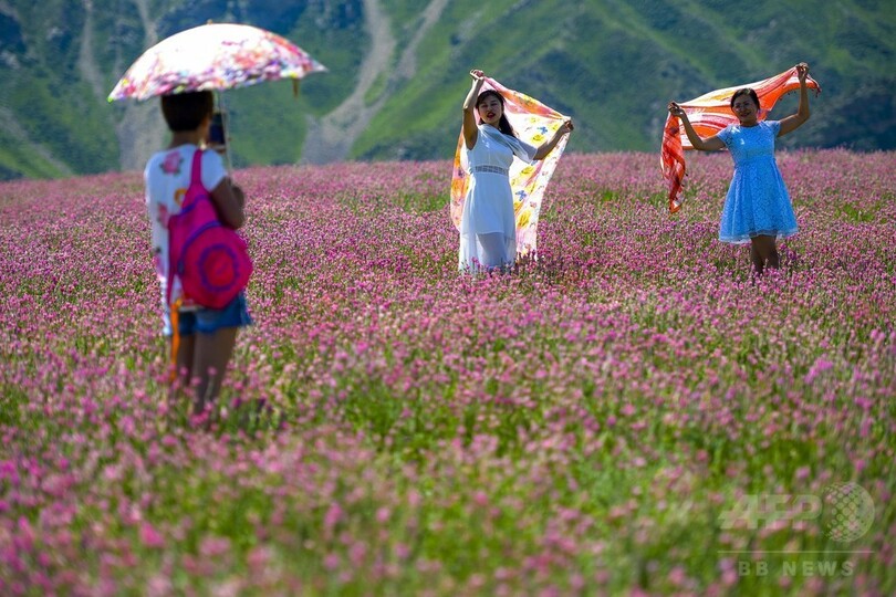 【6月12日 CNS】中国・新疆ウイグル自治区(Xinjiang Uighur Autonomous Region)ウルムチ(Urumqi)市の石人溝(Shirengou)景区にあるイガマメ畑の花が見頃を迎え、人々が記念撮影をするなどしている。イガマメは豆科牧草で「牧草の王様」と呼ばれている。栄養価が高く飼料用として重宝されており、ピンク色の綺麗な花を咲かせる。開花期間はおよそ2週間。(c)CNS/JCM/AFPBB News