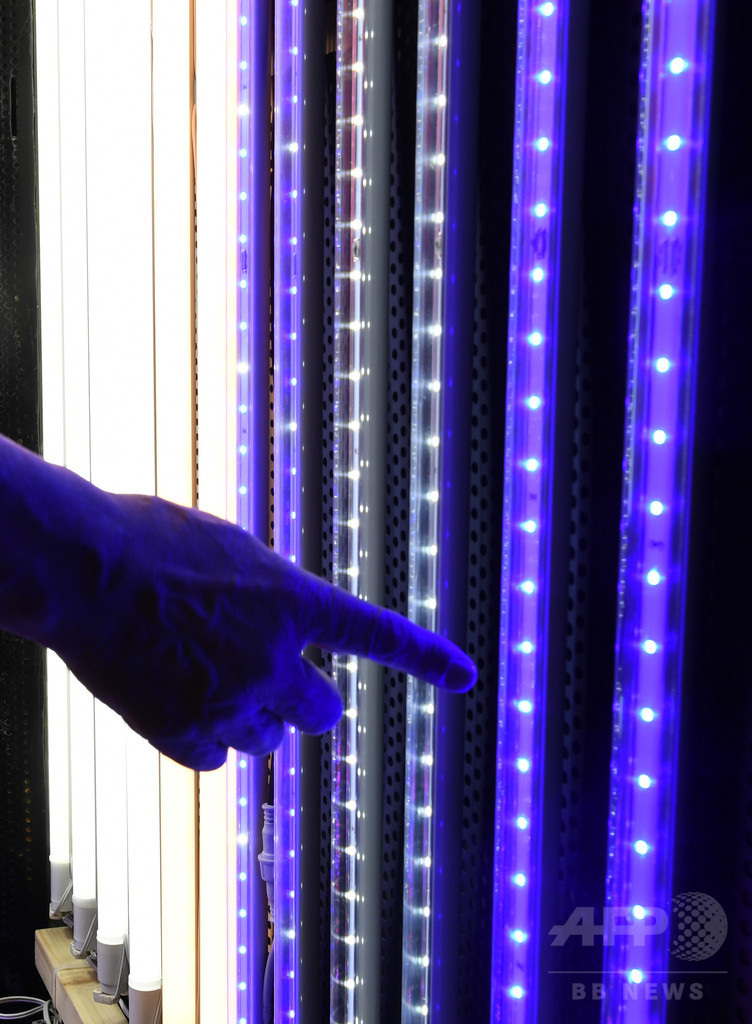 無線制御の調光ユニットを開発する電球メーカーのウシオライティング(USHIO LIGHTING)によると、赤、青、遠赤外線の白の各色LEDライトの照射時間や組み合わせを調整することで、植物の葉の大きさや柔らかさ、シャキシャキした食感なども自在にコントロールできるという。9日まで。(c)AFPBB News