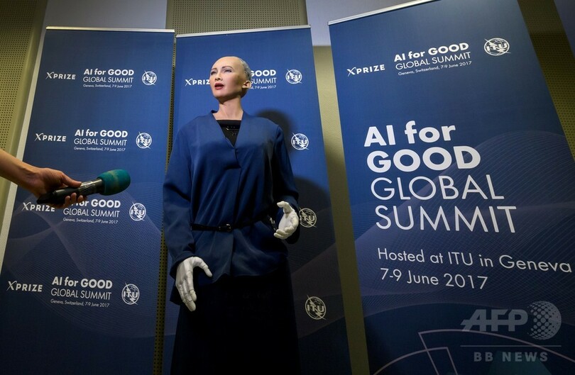 ハンソン・ロボティクス(Hanson Robotics)社が制作したこの人型ロボットは、スイス・ジュネーブ(Geneva)で開催中の、人工知能(AI)を人間にどう役立たせるかをテーマにした国連主催の会議の目玉となっている。