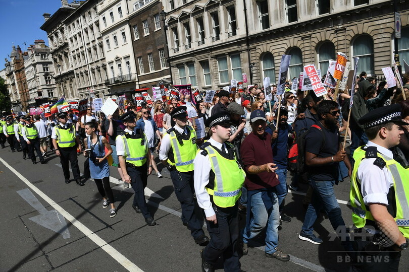 ロンドン(London)ダウニング街(Downing Street)の首相官邸の外では10日、左派のデモが行われ、数百人が「人種差別的で性差別的、同性愛差別的なDUPは去るべきだ」と繰り返し唱えた。DUPが保守党に協力することで「大筋合意」に達したとの発表が出ると、保守党議員の一部からも不満の声が上がった。