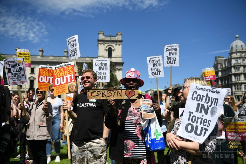 ロンドン(London)ダウニング街(Downing Street)の首相官邸の外では10日、左派のデモが行われ、数百人が「人種差別的で性差別的、同性愛差別的なDUPは去るべきだ」と繰り返し唱えた。DUPが保守党に協力することで「大筋合意」に達したとの発表が出ると、保守党議員の一部からも不満の声が上がった。
