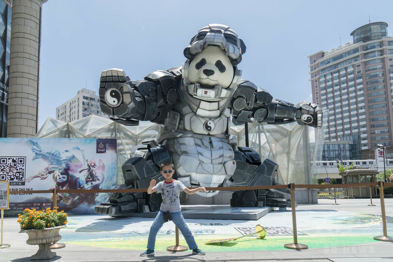 【6月14日 CNS】上海(Shanghai)の環球港(Global Harbor)ショッピングモール前の広場に突如現れた高さ7メートル、重さ5トンのアイアンカンフーパンダ。