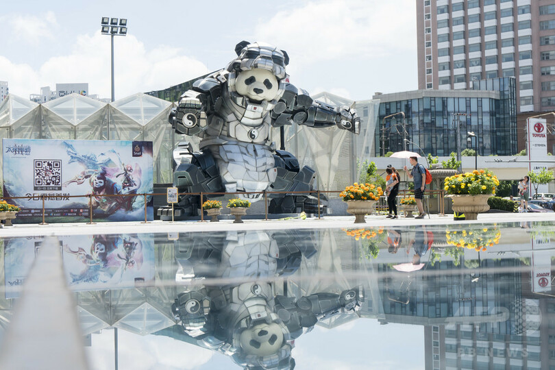 このアイアンカンフーパンダの名前は「アパンダ(阿潘達)」。太極拳のポーズをとっており、胸と手の平には太極図が描かれている。(c)CNS/JCM/AFPBB News