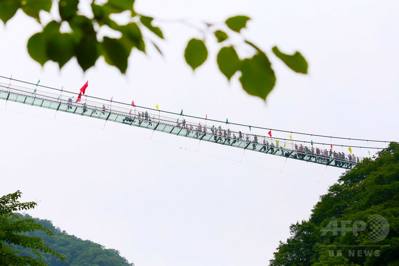 ガラスの吊り橋は大渓谷の上に作られ、長さは216メートル、谷底からの高さは96メートル。橋の本体はガラスを使用した設計で、10ミリ3層構造の合わせガラスで出来ており、1平方メートルの許容荷重は3000キロ。 (c)CNS/JCM/AFPBB News