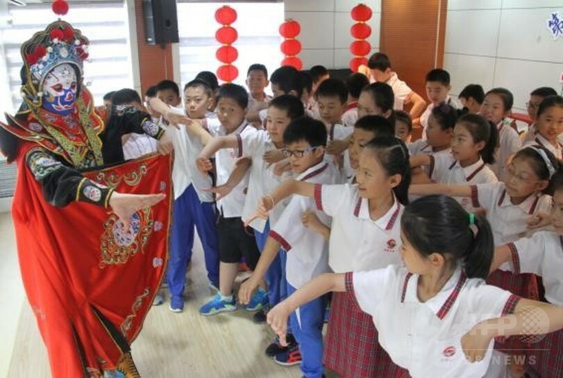 「国際子どもの日(International Children's Day)」を目前に控え、こういった無形文化遺産に触れる活動が毎日行われている。剪紙(切り絵)、吕劇(山東地方の演劇)、藍印花布(藍染)等の伝承人が、直接子どもたちに中国の伝統文化を伝える。(c)CNS/JCM/AFPBB News