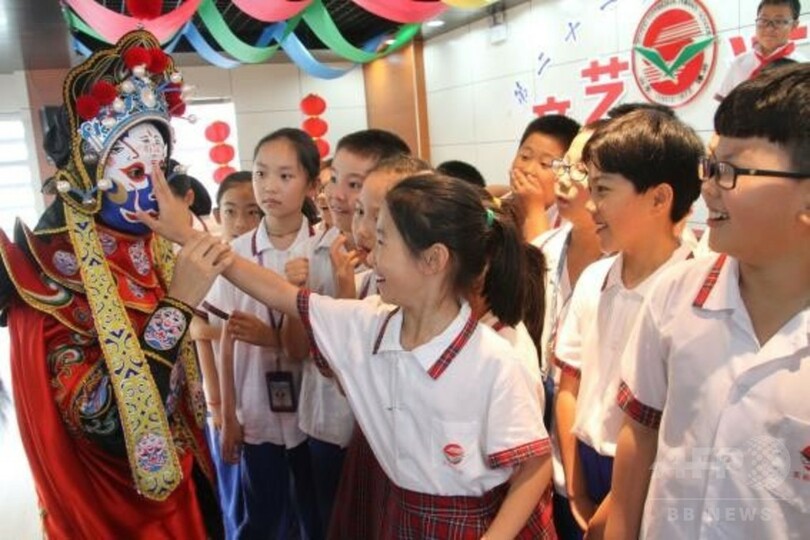 「国際子どもの日(International Children's Day)」を目前に控え、こういった無形文化遺産に触れる活動が毎日行われている。剪紙(切り絵)、吕劇(山東地方の演劇)、藍印花布(藍染)等の伝承人が、直接子どもたちに中国の伝統文化を伝える。(c)CNS/JCM/AFPBB News