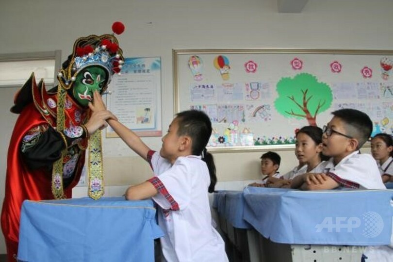 「国際子どもの日(International Children's Day)」を目前に控え、こういった無形文化遺産に触れる活動が毎日行われている。剪紙(切り絵)、吕劇(山東地方の演劇)、藍印花布(藍染)等の伝承人が、直接子どもたちに中国の伝統文化を伝える。(c)CNS/JCM/AFPBB News