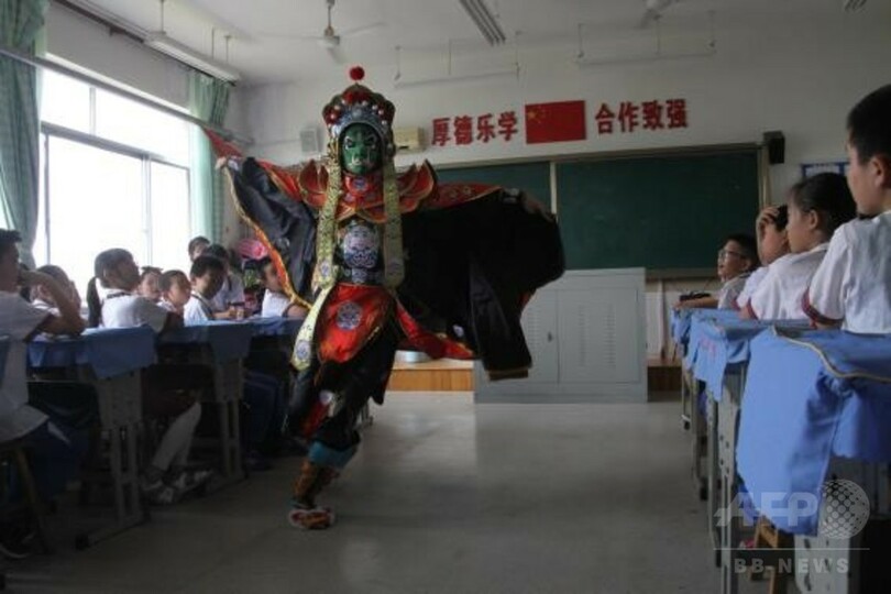 「国際子どもの日(International Children's Day)」を目前に控え、こういった無形文化遺産に触れる活動が毎日行われている。剪紙(切り絵)、吕劇(山東地方の演劇)、藍印花布(藍染)等の伝承人が、直接子どもたちに中国の伝統文化を伝える。(c)CNS/JCM/AFPBB News