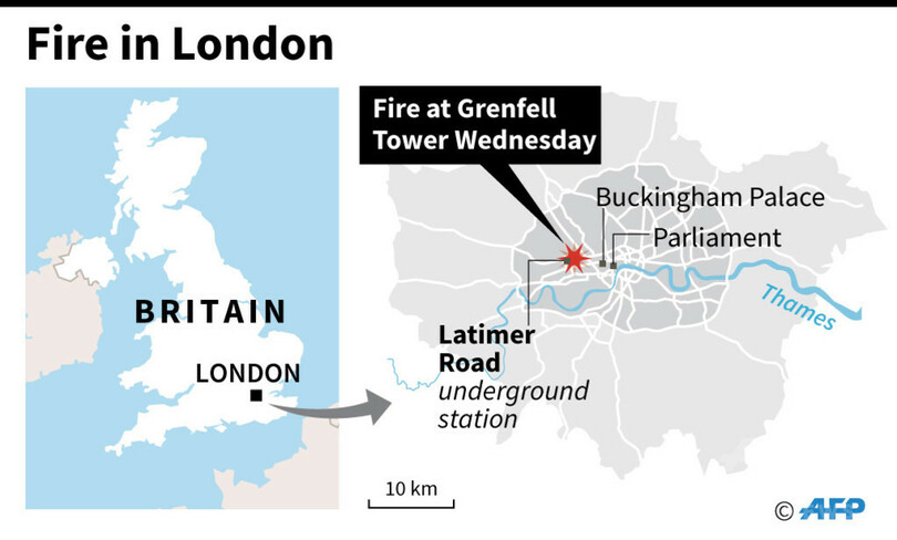 【6月14日 AFP】(更新、写真追加)英ロンドン(London)西部の24階建て高層住宅で14日未明、大規模な火災が発生し、ロンドン市消防局(London Fire Brigade)は、複数の死者が出ていると発表した。また、救急当局によると少なくとも30人が病院に搬送され、複数の住民が建物内に取り残されているとみられる。