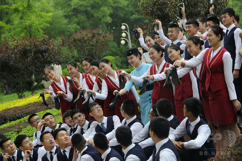【6月21日 CNS】中国山西(Snanxi)省太原(Taiyuan)市にある山西旅行職業学院(Tourism College Of Shanxi)の客室乗務員専攻の卒業生たちが、CAの制服を身に着け同学院内で卒業記念の写真を撮った。青春の思い出の1ページとし、大空へ旅立っていく。(c)CNS/JCM/AFPBB News