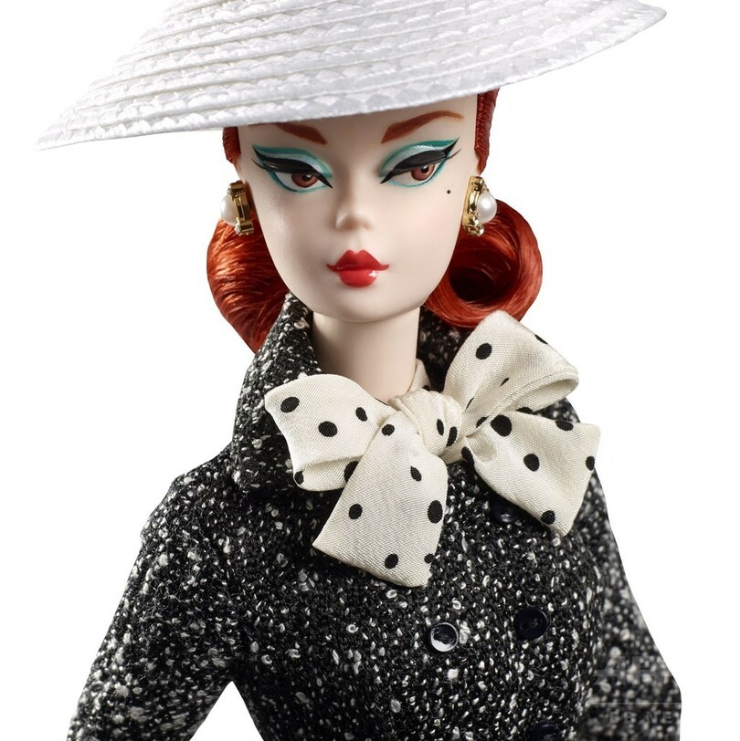 シックでスタイリッシュな「ブラック&ホワイト ツィードスーツ バービー」は、赤い髪のバービーが、ブラックとホワイトのツィードスーツをまとったモデル。スーツのボタンは上までとまり、白いドット柄のシフォンブラウスのリボンが、ファッションにモダンなテイストを加えている。さらにゴールドとパールのイヤリングや白い帽子が、全体のアクセントに。美しい黒いハンドバッグはゴールドのチャーム付きで、よりリアルなディテールにまでこだわっている。
