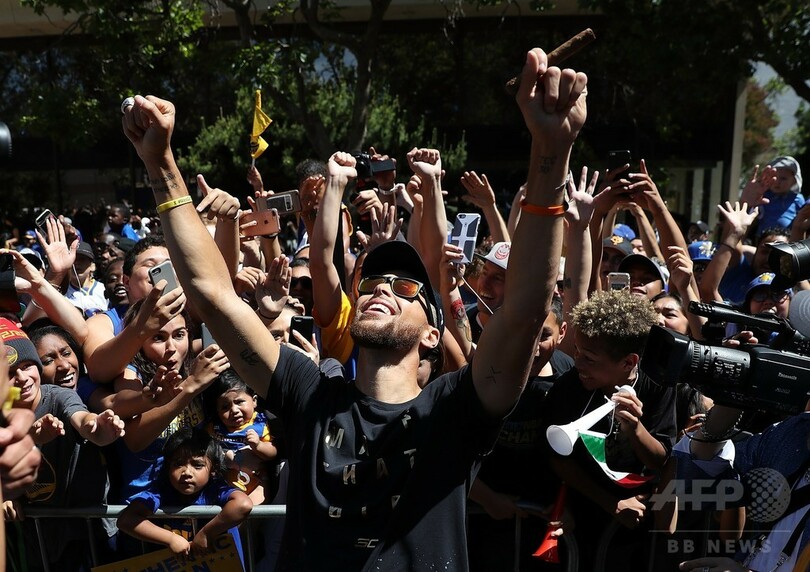 【6月16日 AFP】NBAファイナル制覇を果たしたゴールデンステイト・ウォリアーズ(Golden State Warriors)が15日、米カリフォルニア(California)州オークランド(Oakland)で優勝パレードを行い、集まった大観衆に向かって2階建てバスから手を振った。