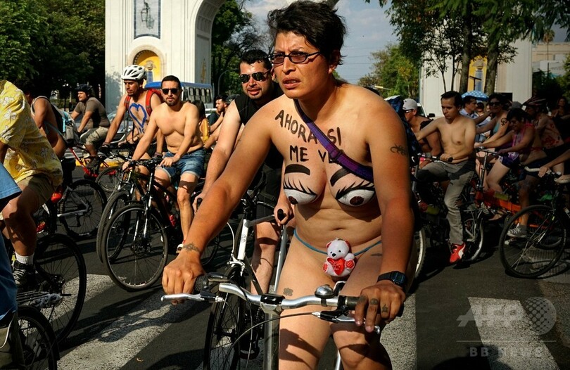 「ワールド・ネーキッド・バイク・ライド」は世界各地で開催されており、その参加者たちは世界の石油依存の体質に異議を唱えたり、自転車に乗る人々の権利を訴えたりしている。(c)AFP