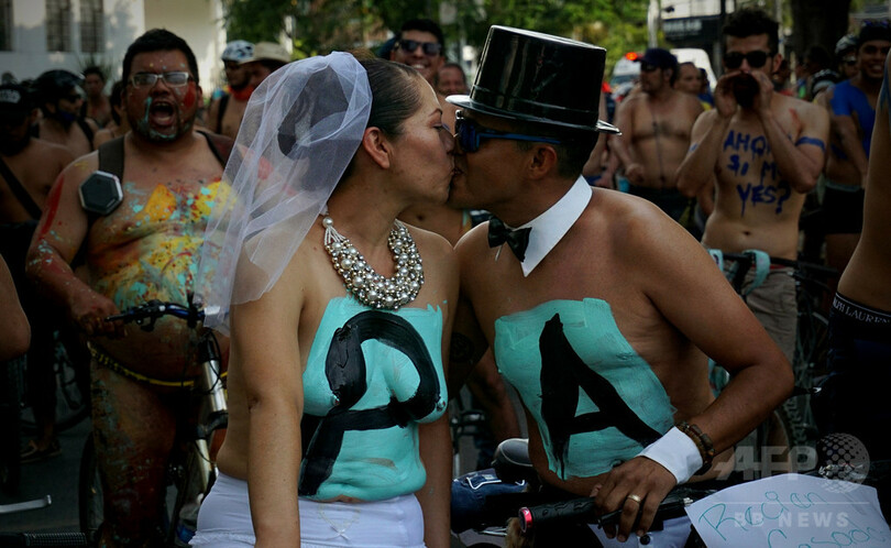 裸のサイクリスト集団、車の排ガスに抗議 メキシコ