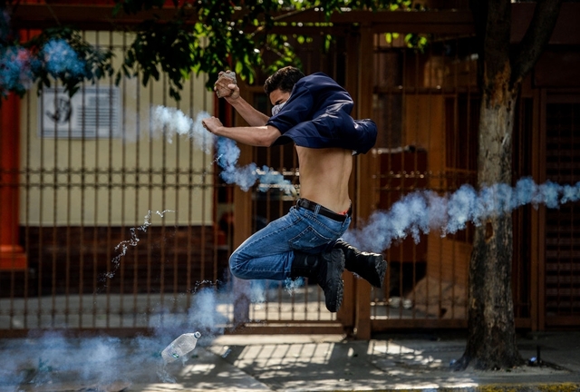 午後になると、カラカスの空模様は一変する。催涙ガスの大きな雲が街の方々で広がり、石と火炎瓶の雨が降る。そのような戦闘の真っただ中、つまりクライアントに過去40日間絶え間なく提供してきたような見応えのある写真を撮るためには、取材班が必ずや身を置かなければならない場所に入り込んでしまうと、考える時間などほとんどない。過去の経験から学んできたこと、または直感が示すことを実行に移すまでだ。