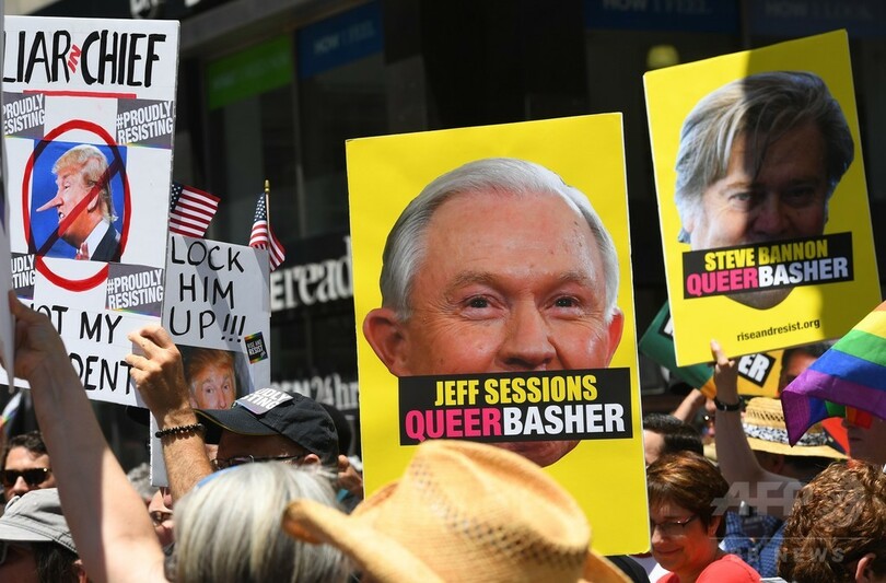 【6月26日 AFP】「ゲイ・プライド(Gay Pride)」のパレードが25日、米ニューヨーク(New York)で行われ、参加者数万人が市内を練り歩いた。このLGBT(レズビアン、ゲイ、バイセクシュアル、トランスジェンダー)の祭典では、7色の旗を誇らしげに振る人や、ドナルド・トランプ(Donald Trump)米大統領に抗議するプラカードを掲げた人も多数見られた。