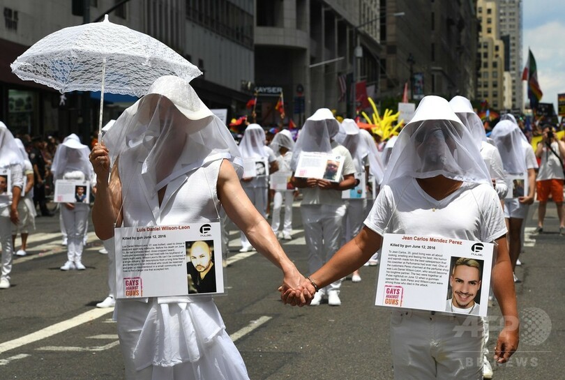 マンハッタン(Manhattan)のミッドタウンからグリニッジ・ビレッジ(Greenwich Village)までの約3キロのルートは、徒歩やオートバイ、トラックの荷台に乗って参加した人々で埋め尽くされた。グリニッジ・ビレッジは、1969年のいわゆる「ストーンウォールの反乱(Stonewall Uprising)」後、同性愛者の権利向上を訴える運動が生まれた場所でもある。