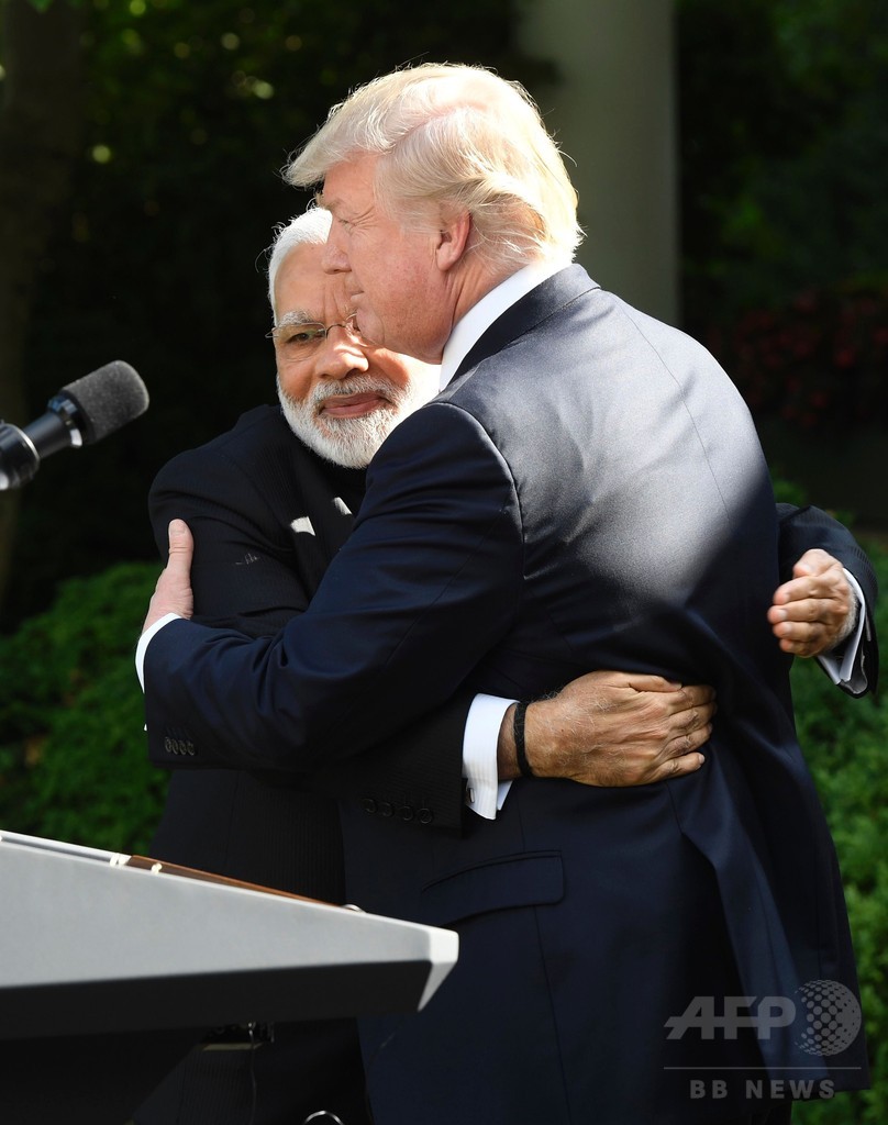 【6月27日 AFP】米国のドナルド・トランプ(Donald Trump)大統領とインドのナレンドラ・モディ(Narendra Modi)首相は26日、米ホワイトハウス(White House)で初の首脳会談を行った。直後の記者会見では、報道陣の前で何度も抱き合うなど「ブロマンス」(ブラザーとロマンスをかけた造語)と言える親密ぶりをアピールした。