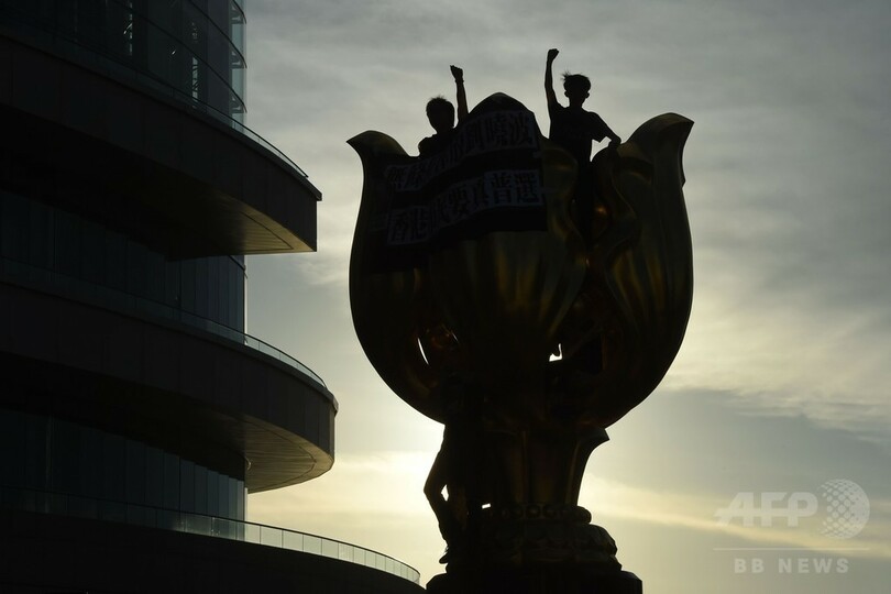 デモ参加者らが取り囲んでいた金紫荊像は、1997年の香港返還を記念して中国から贈呈されたもので、以来、香港の象徴となっている。(c)AFP
