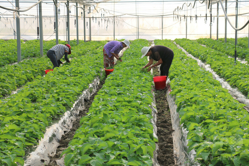 【7月5日 CNS】中国・江蘇(Jiangsu)省灌雲(Guanyun)県にある現代農業園区で、シソの葉の摘み取りが行われている。同県から100万枚、3552キロの新鮮なシソの葉が検査を経て日本へ輸出された。