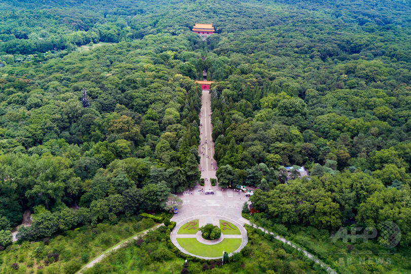 【7月9日 CNS】南京(Nanjing)郊外の鐘山(Zhongshan)風景区の紫金山(Zijinshan)南麓に位置する明孝陵(Ming Xiaoling Mausoleum)上空からの様子。世界遺産に登録されてから14周年の記念日に当たる3日、撮影した。空からの景色は、帝王たちが眠る荘厳な雰囲気を感じさせる。