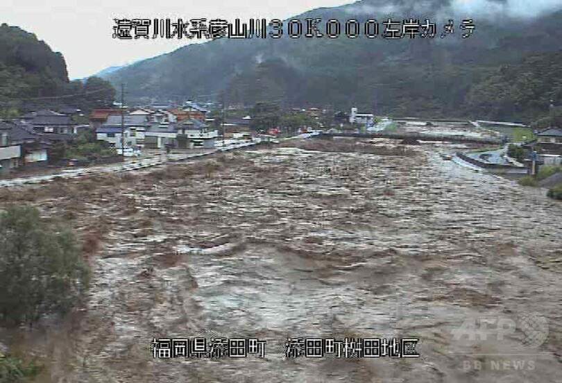 【7月6日 AFP】(写真追加)九州北部は5日、記録的な大雨に見舞われ、河川の氾濫や土砂災害で少なくとも2人が死亡、18人が行方不明となっている。気象庁は福岡県と大分県に大雨特別警報を発令し、「これまでに経験したことのないような大雨」で「重大な危険が差し迫った異常事態」だとして地域住民に避難と安全の確保を呼び掛けている。