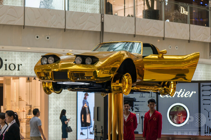 【7月10日 CNS】上海(Shanghai)の陸家嘴(Lujiazui)にある大型ショッピングモールの1階広場の空中に5日、黄金にまばゆく光る旧型のスポーツカーが現れた。周囲のガラスケースの中には、黄金の自動車部品も飾られ、買い物客の視線はその輝きに吸い寄せられていた。