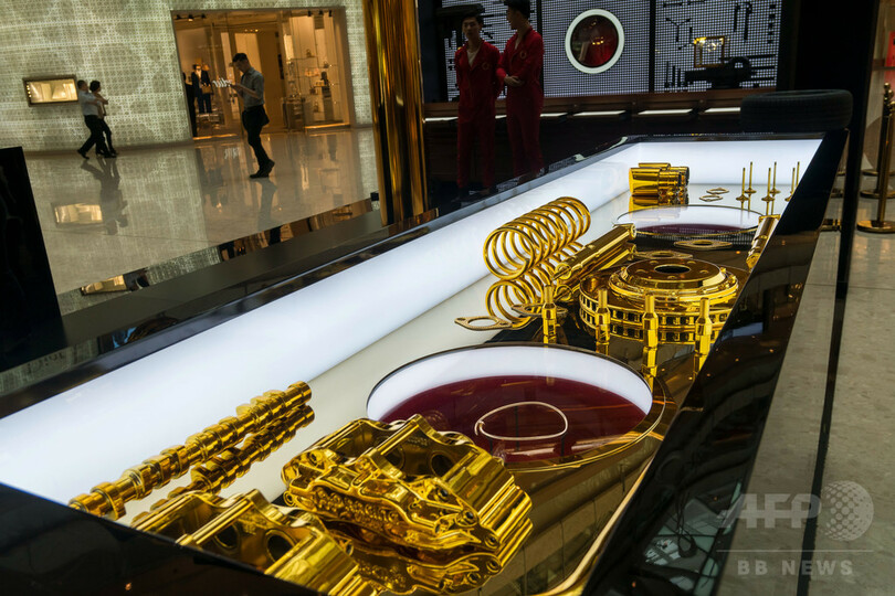 【7月10日 CNS】上海(Shanghai)の陸家嘴(Lujiazui)にある大型ショッピングモールの1階広場の空中に5日、黄金にまばゆく光る旧型のスポーツカーが現れた。周囲のガラスケースの中には、黄金の自動車部品も飾られ、買い物客の視線はその輝きに吸い寄せられていた。