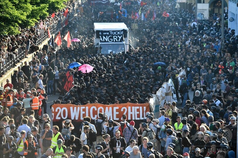 1万2000人のデモ隊は「G20をたたき潰せ!」や「地獄へようこそ」と書かれた横断幕を掲げ、午後7時(日本時間7日午前2時)に首脳会議の会場へ向けて行進を開始。だがデモ参加者約1000人が、黒いフードや覆面を取るよう求めた警察の指示に従わず、行進は開始直後に制止された。