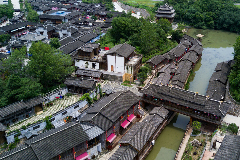 【7月13日 CNS】山林と町並みが互いに引立て合い、静寂な雰囲気を醸し出している集落。江蘇(Jiangsu)省 句容(Jurou)市 宝華山(Baohuashan)の麓にある「千華古村(Qianhuai Gucun)」を4日、上空から撮影した。