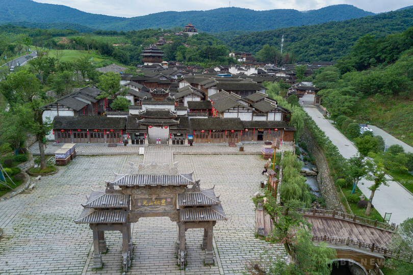 【7月13日 CNS】山林と町並みが互いに引立て合い、静寂な雰囲気を醸し出している集落。江蘇(Jiangsu)省 句容(Jurou)市 宝華山(Baohuashan)の麓にある「千華古村(Qianhuai Gucun)」を4日、上空から撮影した。