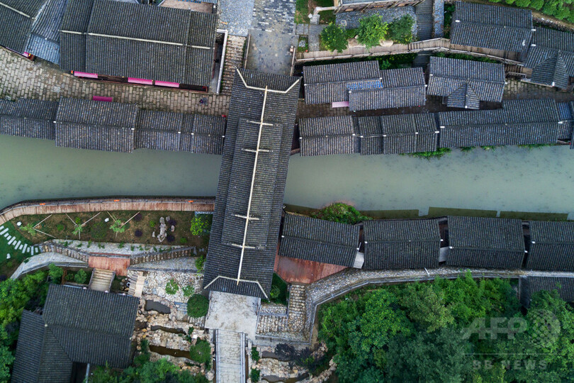 【7月13日 CNS】山林と町並みが互いに引立て合い、静寂な雰囲気を醸し出している集落。江蘇(Jiangsu)省 句容(Jurou)市 宝華山(Baohuashan)の麓にある「千華古村(Qianhuai Gucun)」を4日、上空から撮影した。
