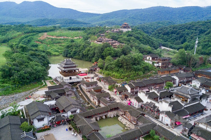 【7月13日 CNS】山林と町並みが互いに引立て合い、静寂な雰囲気を醸し出している集落。江蘇(Jiangsu)省 句容(Jurou)市 宝華山(Baohuashan)の麓にある「千華古村(Qianhuai Gucun)」を4日、上空から撮影した。