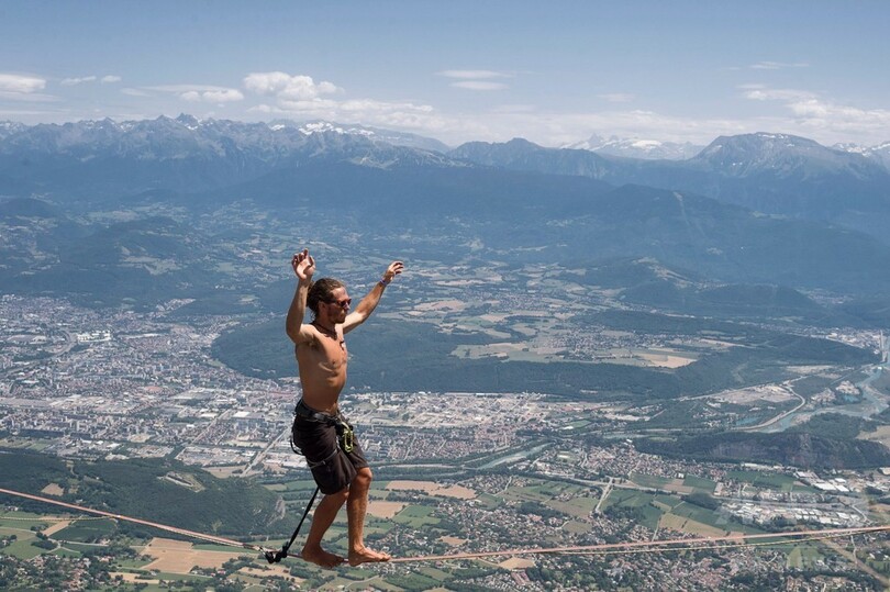 絶景を背に綱渡り、仏東部で「スラックライン」イベント