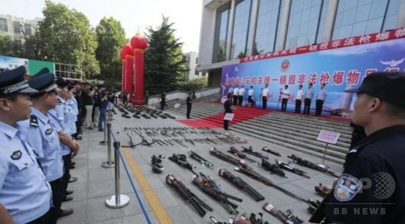 河南省(Henan)鄭州市(Zhengzhou)でも7日、銃火器658丁、弾薬14万発、爆薬約130トン、雷管(起爆装置)14.9万個、モデルガン2500丁、刀剣4100本、クロスボウ164丁、化学薬品827キロを押収した。違法銃火器や刀剣類は、同市の河南済源鉄鋼グループの管理する工場ですべて処分された。(c)CNS/JCM/AFPBB News