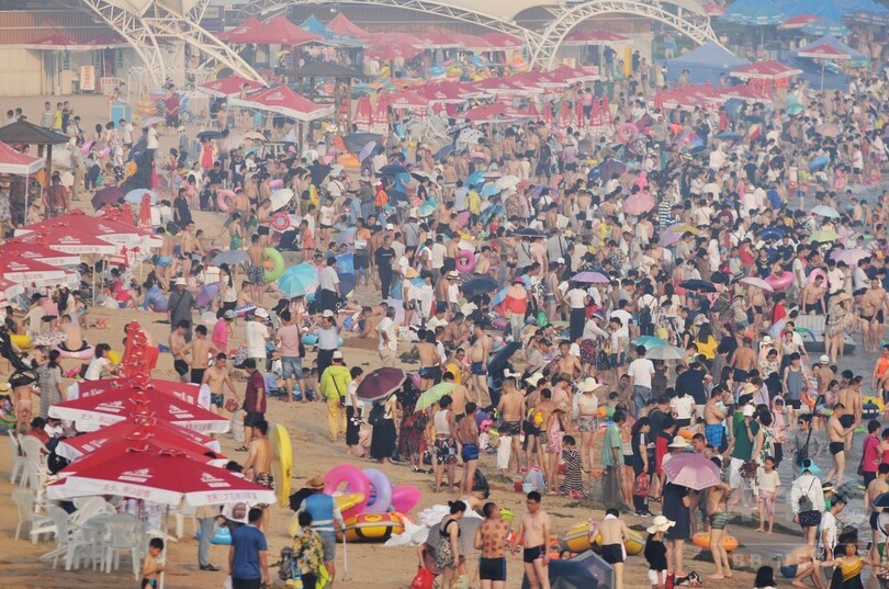 【7月16日 CNS】旧暦の土用入りとなった12日、最高気温を迎えた青島市(Qingdao)の第1海水浴場には数万人が海水浴に訪れ、海辺はまるで「鍋の中の水餃子(「芋洗い」状態)」だった。(c)CNS/JCM/AFPBB News