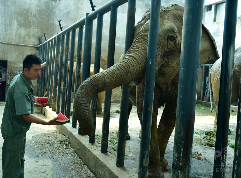 氷の塊、夏野菜や果物。空調を設置したり、池に水をためて涼んでもらったり、日よけネットを用意したり。同動物園では、動物たちのためにさまざまな暑さ対策を行っている。(c)CNS/JCM/AFPBB News