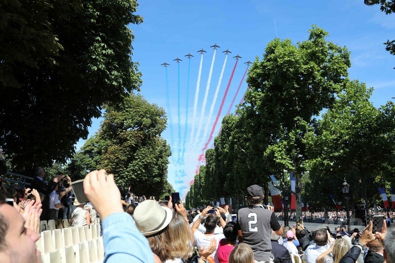 今年は米国が第1次世界大戦(World War I)に参戦してから100年目に当たり、マクロン大統領はトランプ大統領を式典に招待。パレードにはフランス軍に加えて、当時の軍服を着た米軍兵士も含め、計3720人が参加した。上空では仏空軍機に加え、米軍のアクロバット飛行隊がF22戦闘機2機と共に儀礼飛行を行った。