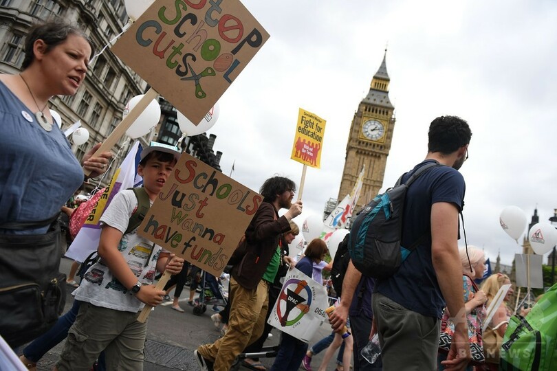 【7月17日 AFP】英ロンドン(Londo)中心部で16日、すべての学校に公平な助成を求めるデモが行われ、教師や生徒、保護者らが参加した。子どもたちもプラカードを掲げたり拡声器を使ったりしながら、市中心部のホワイトホールガーデンから(Whitehall Gardens)から国会議事堂前の広場「パーラメント・スクエア(Parliament Square)」まで行進した。(c)AFP