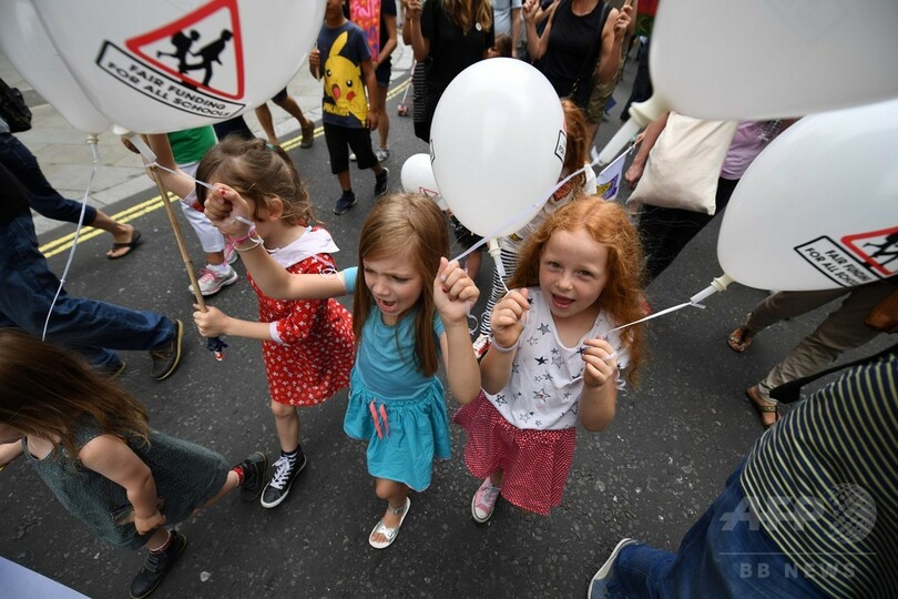 【7月17日 AFP】英ロンドン(Londo)中心部で16日、すべての学校に公平な助成を求めるデモが行われ、教師や生徒、保護者らが参加した。子どもたちもプラカードを掲げたり拡声器を使ったりしながら、市中心部のホワイトホールガーデンから(Whitehall Gardens)から国会議事堂前の広場「パーラメント・スクエア(Parliament Square)」まで行進した。(c)AFP