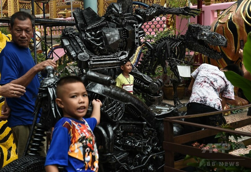 【7月30日 AFP】タイの寺院を救うため、スーパーヒーローがやって来た? タイの複数の寺院で、親と一緒にやってきた子どもたちが楽しめるよう漫画のキャラクターやおもちゃのロボットを模した巨大な像が設置され、参拝者を楽しませている。
