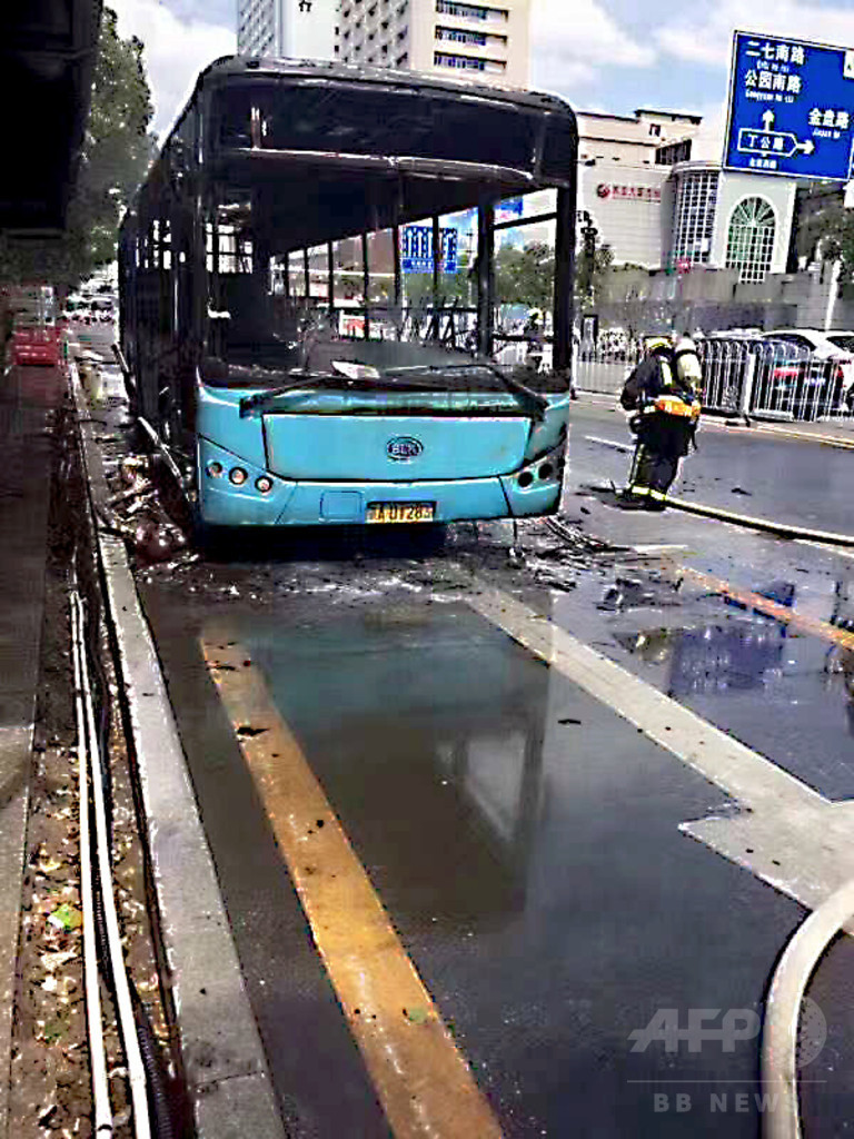 【7月20日 CNS】7月18日午後2時25分ごろ、江西省(Jiangxi)南昌市(Nanchang)の北京西路(Beijing West Road)丁公路北駅のバス停付近で、東へ向かって走っていた13番の路線バスが炎上した。現場では乗客や通行人などを緊急避難させ、同40分にかけつけた消防隊員によって火は消し止められた。消火後に、車内で男性1人の遺体が発見された。運転手やほかの乗客にけがはなかった。警察の調べによると、一部の乗客が途中、強い刺激臭のする容器を持った男が乗車してきたと話している。死亡した男性の身元についてはまだ調査中だ。(c)CNS/JCM/AFPBB News