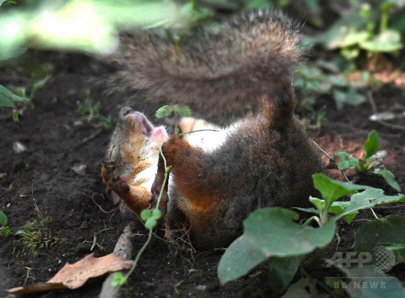 同園のリスを撮影して6年になる都内在住の画家、折原キット(Kit Orihara)さん(50)は「季節ごとに異なる多彩な行動や表情が魅力。普段は巣箱で寝るリスが、暑さで警戒心もなく枝の上でうたた寝する様子も今ならでは」と話した。(c)AFPBB News