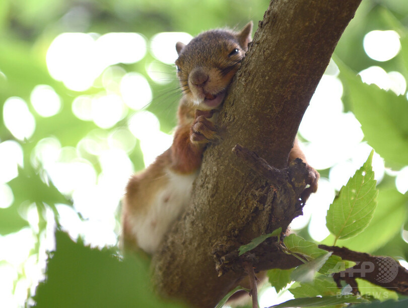 同園のリスを撮影して6年になる都内在住の画家、折原キット(Kit Orihara)さん(50)は「季節ごとに異なる多彩な行動や表情が魅力。普段は巣箱で寝るリスが、暑さで警戒心もなく枝の上でうたた寝する様子も今ならでは」と話した。(c)AFPBB News